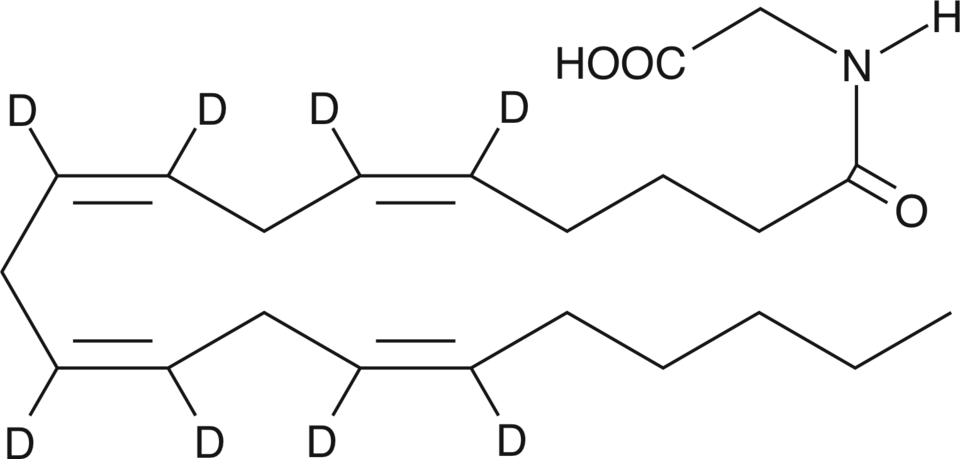 Arachidonoyl glycine-d8 (NAGly-d8) contains eight deuterium atoms at the 5, 6, 8, 9, 11, 12, 14, and 15 positions. It is intended for use as an internal standard for the quantification of NAGly by GC- or LC-mass spectrometry. NAGly has been isolated from cell cultures treated with arachidonoyl ethanolamide (AEA), from extracts of mammalian brain, and has also been synthesized as an analog of AEA for structure/activity testing. NAGly may be produced endogenously via oxidation of AEA, or by transacylation of arachidonoyl coenzyme A. NAGly is reported to have analgesic activities in whole animal...