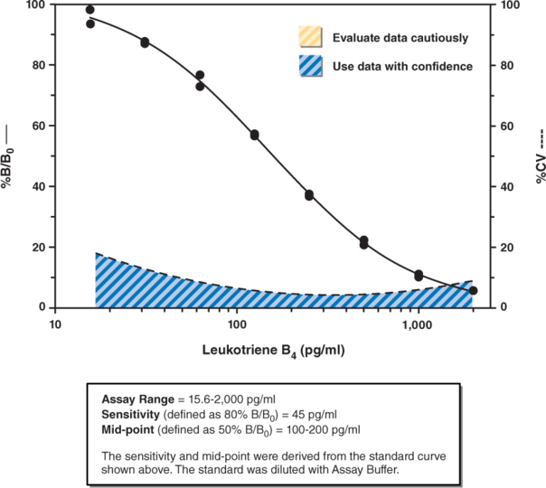 LTB4 stimulates a number of leukocyte functions, including aggregation, stimulation of ion fluxes, enhancement of lysosomal enzyme release, superoxide anion production, chemotaxis, and chemokinesis. Plasma levels of LTB4 increase from <100 pg/ml to >100 ng/ml following leukocyte stimulation. LTB4 is metabolized in leukocytes and hepatocytes to less active 20-hydroxy and 20-carboxy LTB4 and then further oxidized to ω-carboxy dinor LTB4 and ω-carboxy tetranor-LTB3. LTB4 is not excreted in the urine. Caymans LTB4 Express ELISA Kit is a competitive assay that can be used for quantification of LTB4...