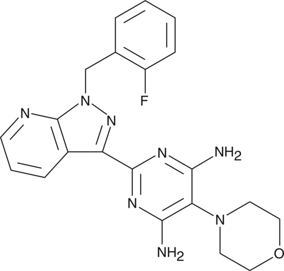 Soluble guanylate cyclase (sGC) is the primary cellular receptor for nitric oxide (NO). NO binds and activates a heme group in sGC, initiating the conversion of GTP to the second messenger cyclic GMP (cGMP). BAY 41-8543 is a heme-dependent stimulator of sGC, increasing the activity of recombinant sGC dose-dependently, from 0.1 nM to 100 μM, up to 92-fold. Surprisingly, NO donors synergize with BAY 41-8543 in stimulating recombinant sGC. BAY 41-8543 relaxes vessels and inhibits platelet aggregation in vitro at nM concentrations. In vivo, BAY 41-8543 decreases blood pressure dose-dependently,...