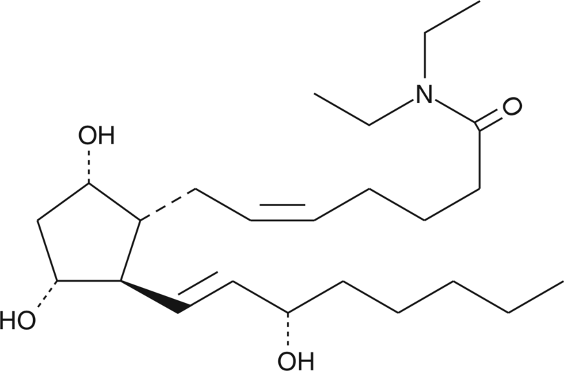 Prostaglandin F2α diethyl amide (PGF2α-NEt2) is an analog of PGF2α (Item No. 16010) in which the C-1 carboxyl group has been modified to an N-diethyl amide. PG esters have been shown to have ocular hypotensive activity. PG N-ethyl amides were recently introduced as alternative PG hypotensive prodrugs. Studies in our laboratories have shown that bovine and human corneal tissue converts the N-ethyl amides of various PGs to the free acids with a conversion efficiency of about 4 µg/g corneal tissue/hr. However, we find that dialkyl amides such as PGF2α-NEt2 are inert to corneal amidase activity, and...