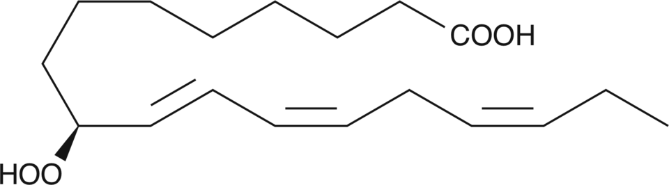 9(S)-HpOTrE is a monohydroperoxy polyunsaturated fatty acid produced by the action of 5-lipoxygenase (5-LO) on α-linolenic acid. It can be further metabolized to colnelenic acid by a divinyl ether synthase activity found in garlic and potato microsomal fractions. 9(S)-HpOTrE also serves as a substrate for further oxidation by both soybean and potato LOs, resulting in the formation of 9,16-dihydroperoxy acid. The suicide inactivation of LOs when 9(S)-HpOTrE is used as a substrate is thought to occur via formation of an unstable epoxide.