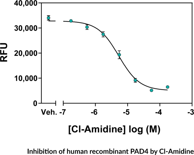 Caymans PAD4 Inhibitor Screening Assay Kit (Ammonia) provides a convenient method for screening human PAD4 inhibitors. PAD4 deiminates N-α-benzoyl-L-arginine ethyl ester (BAEE), a non-natural substrate with similar kinetic properties to the natural substrates, producing ammonia.3 Ammonia reacts with a detector resulting in a fluorescent product. Fluorescence is then analyzed with an excitation wavelength of 405-415 nm and an emission wavelength of 470-480 nm.