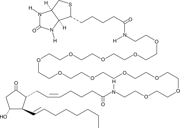 PGE2-PEG11-biotin is an affinity probe which allows PGE2 to be detected or immobilized using the biotin ligand. The PEG11 moiety serves to separate the biotin linker from PGE2 with a hydrophilic spacer. It is thus a tool to be used in the elucidation of PGE2 actions or interactions in aqueous solutions.