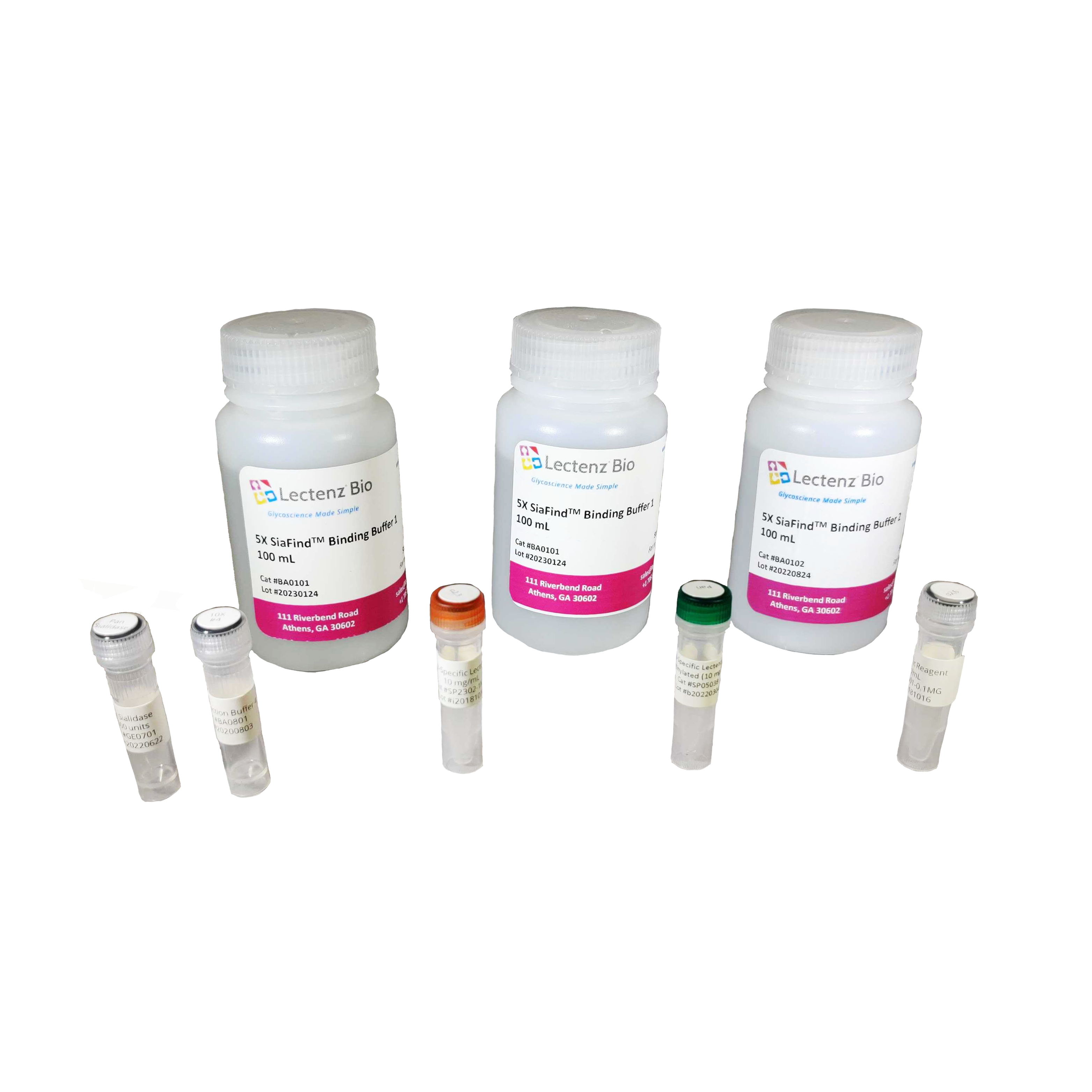 The SiaFind™ Lectenz® and reagents are supplied lyophilized in a storage buffer (50 mM EPPS, 200 mM NaCl, pH 7.5) and should be reconstituted in 100 μL molecular water grade to yield a 10 mg/mL solution (SP2302 and SP0502) or 1 mg/mL solution (SP2602). Concentration is determined by spectrophotometry using E1% 22.0. Once reconstituted, store at 4°C for up to 5 days or -20°C for up to 6 months. Aliquoting is recommended to avoid repeated freeze-thaw cycles.